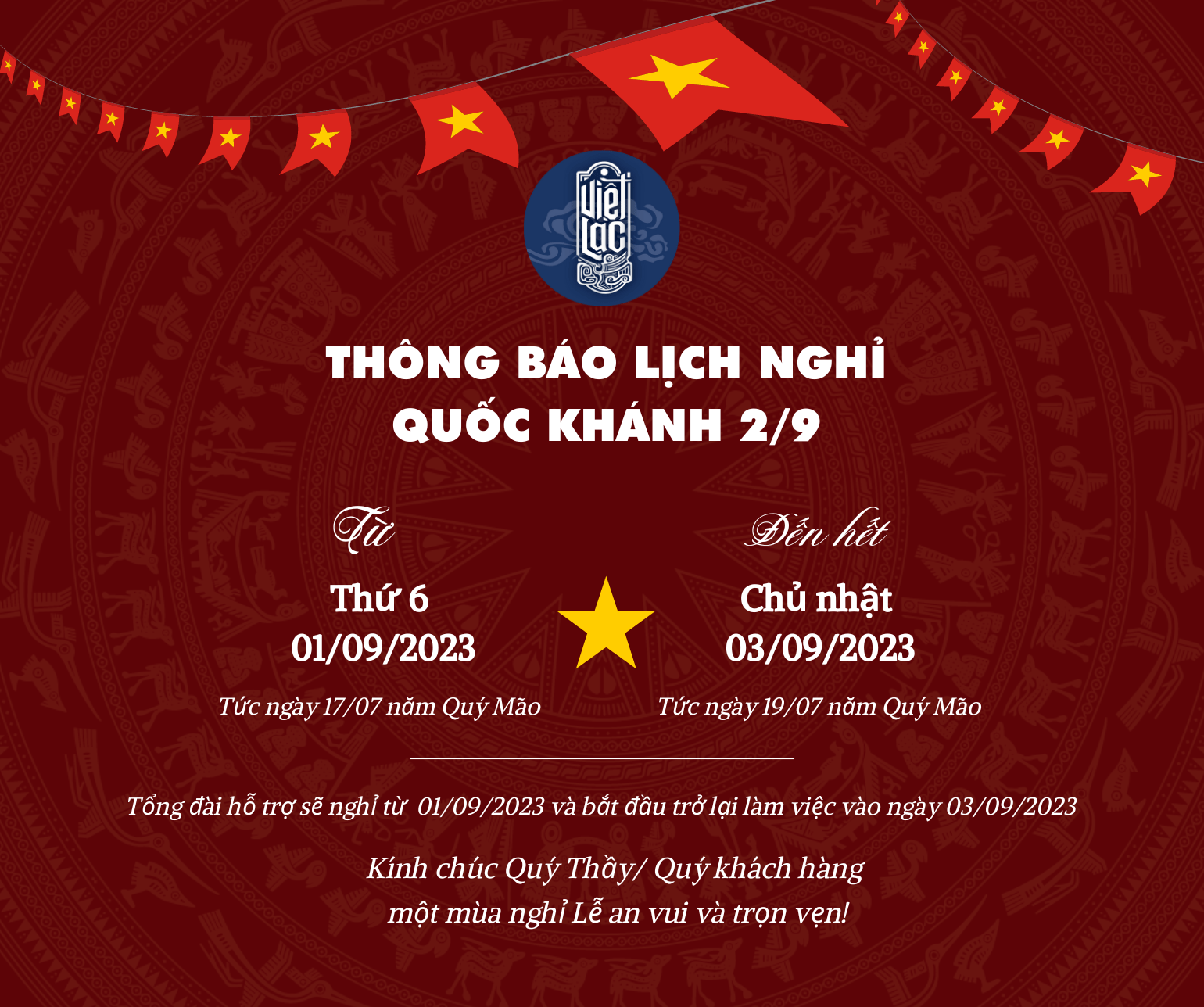 Để thuận tiện cho việc hỗ trợ khách hàng, Việt Lạc xin thông báo lịch nghỉ lễ Quốc Khánh 2/9/2023 như sau: