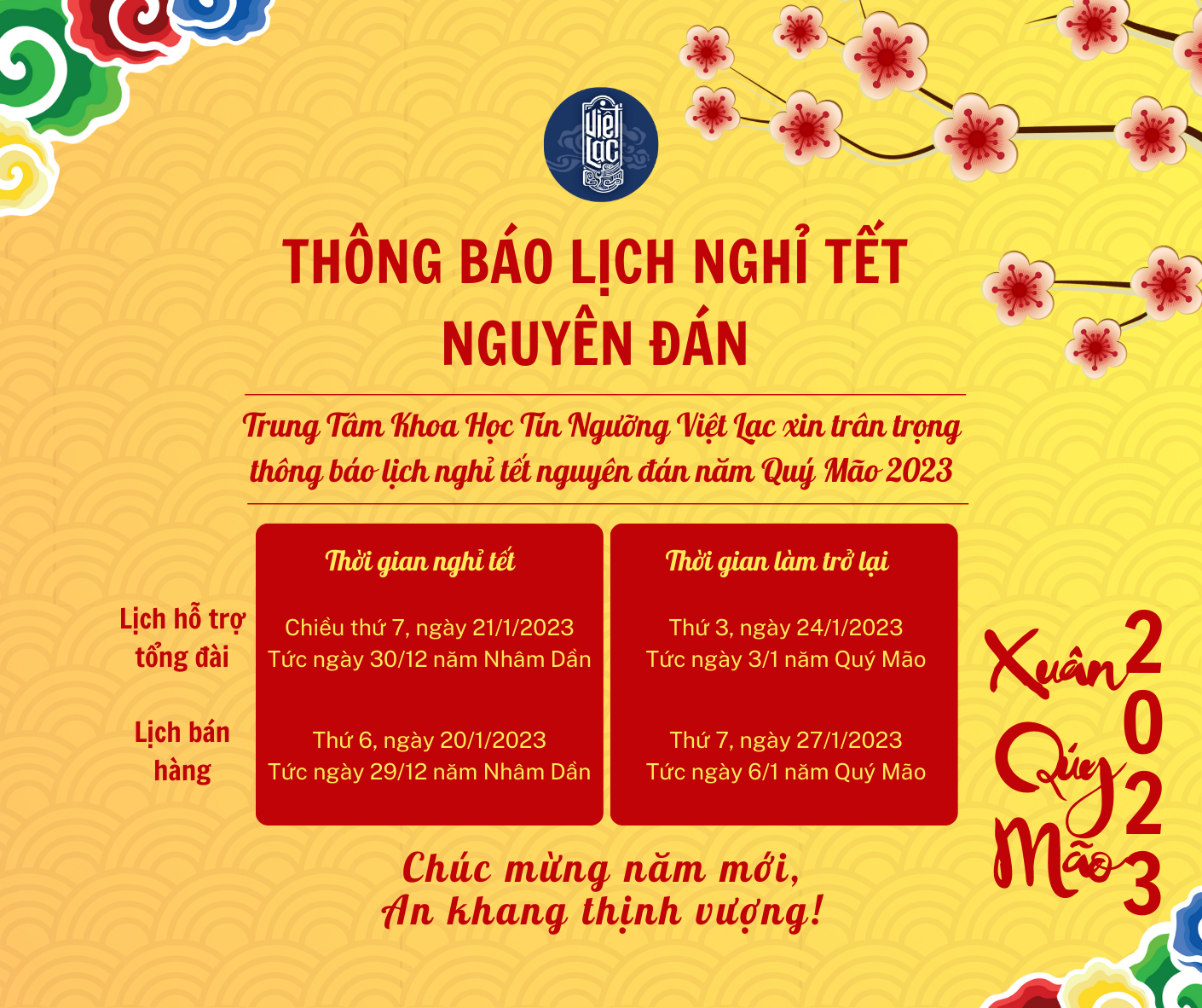 Để thuận tiện cho việc hỗ trợ khách hàng, Việt Lạc xin thông báo lịch nghỉ Tết Nguyên Đán 2023 như sau: